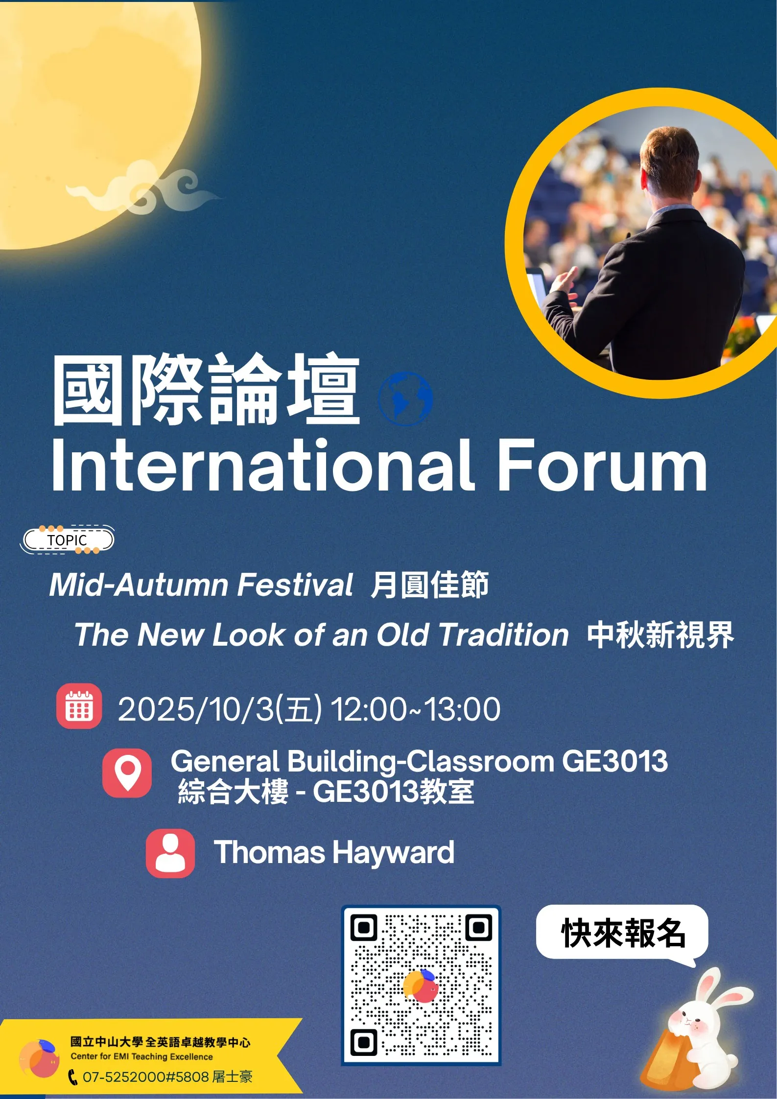 International Forum連結本地學生與國際學生,透過各種豐富的主題,例如:時下國際議題、各國文化差異,抑或是生活時事作為討論方向,促使本地學生與國際學生能夠相互交流,增進世界各國與台灣之間的文化和習俗的交流。藉由如此的活動模式培養同學們多元的思考能力,並以此提升同學們的英文口語表達能力。